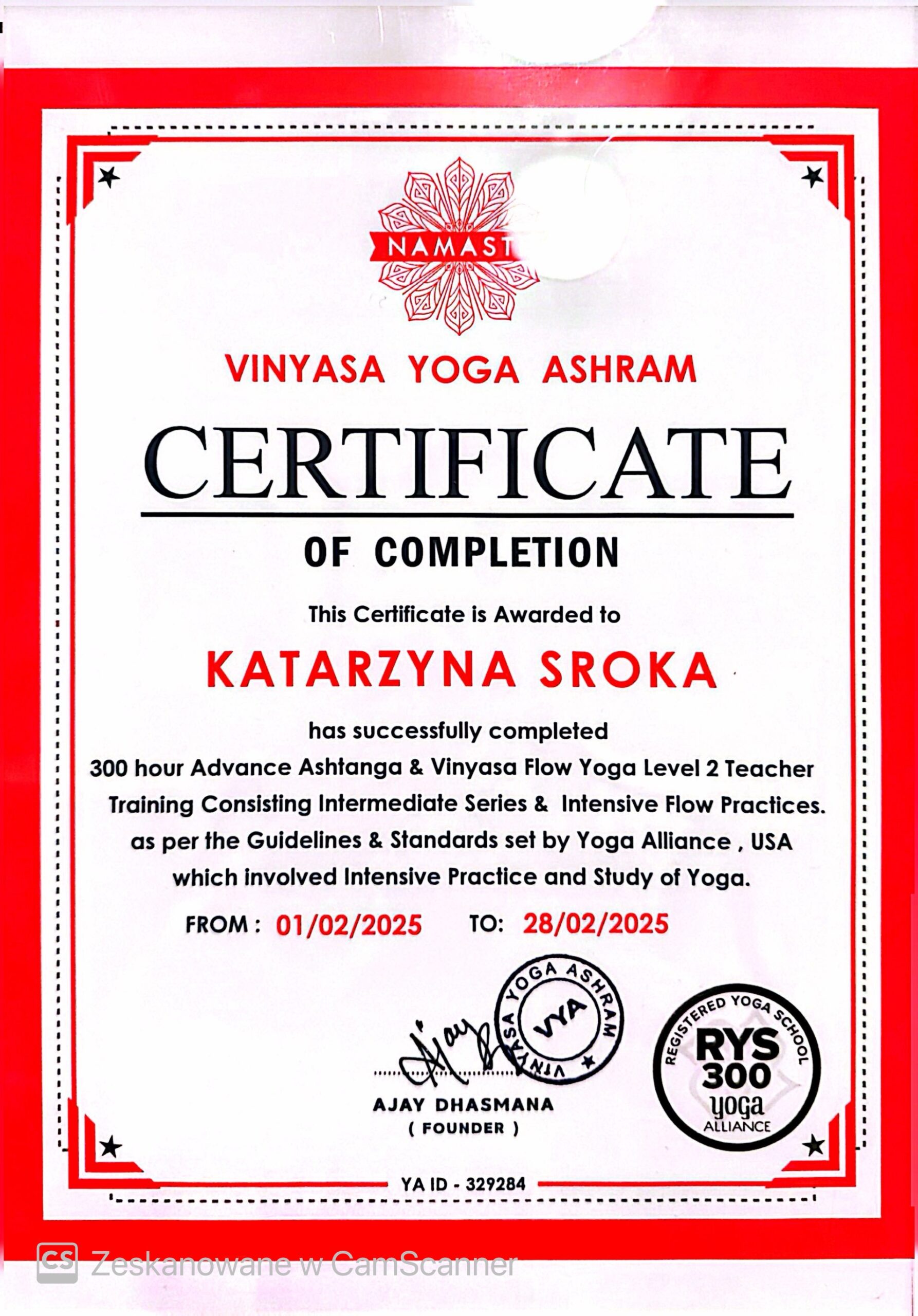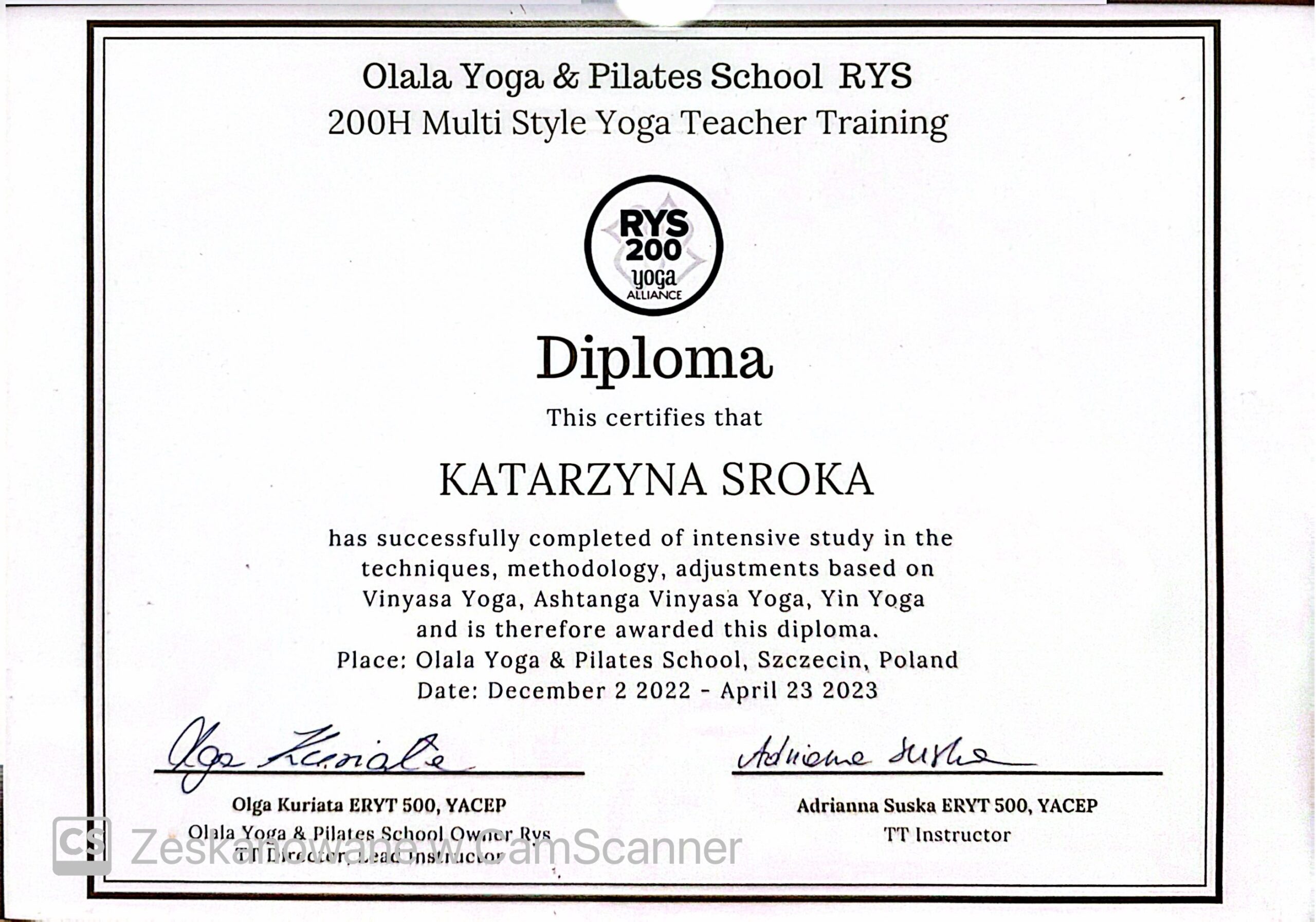 Posiadam również dyplom terapeuty jogą Yoga Sadhana Seva Trust RYT100, uczyłam się u Dr. Rajesh’a Kumar’a, mistrza jogi, jogi kundalini, tantry i terapeuty jogą.